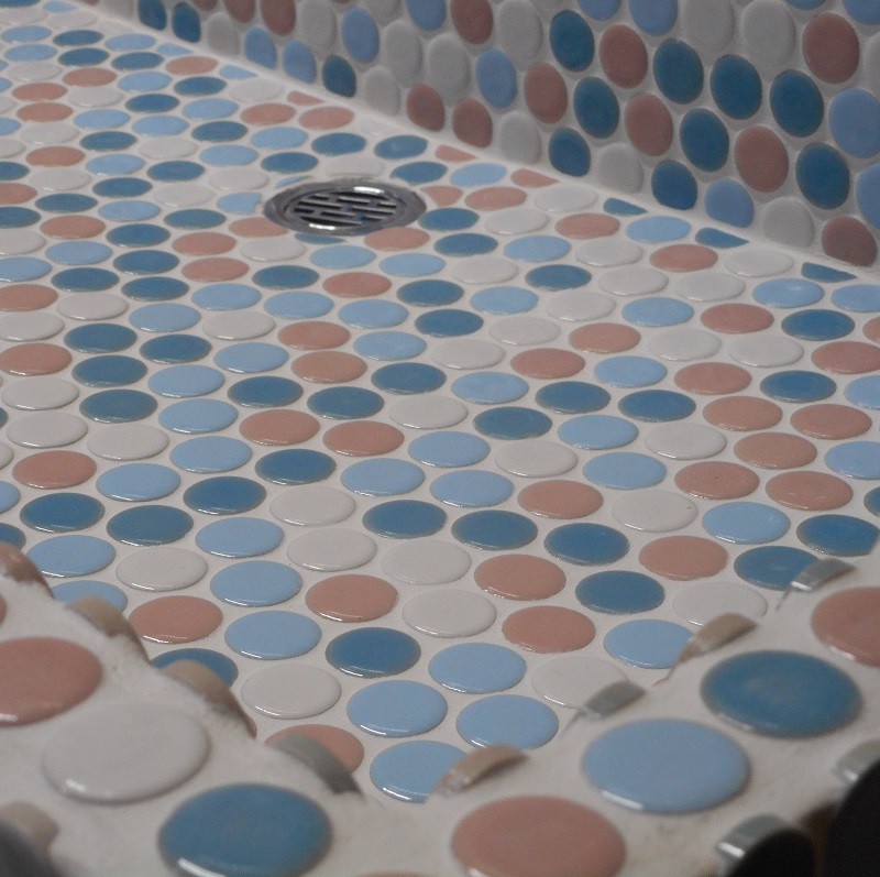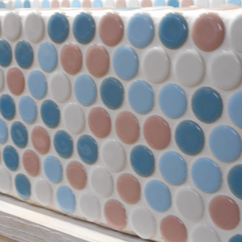 水色 桃色 空色の19ミリの丸いモザイクタイルをはった流し台