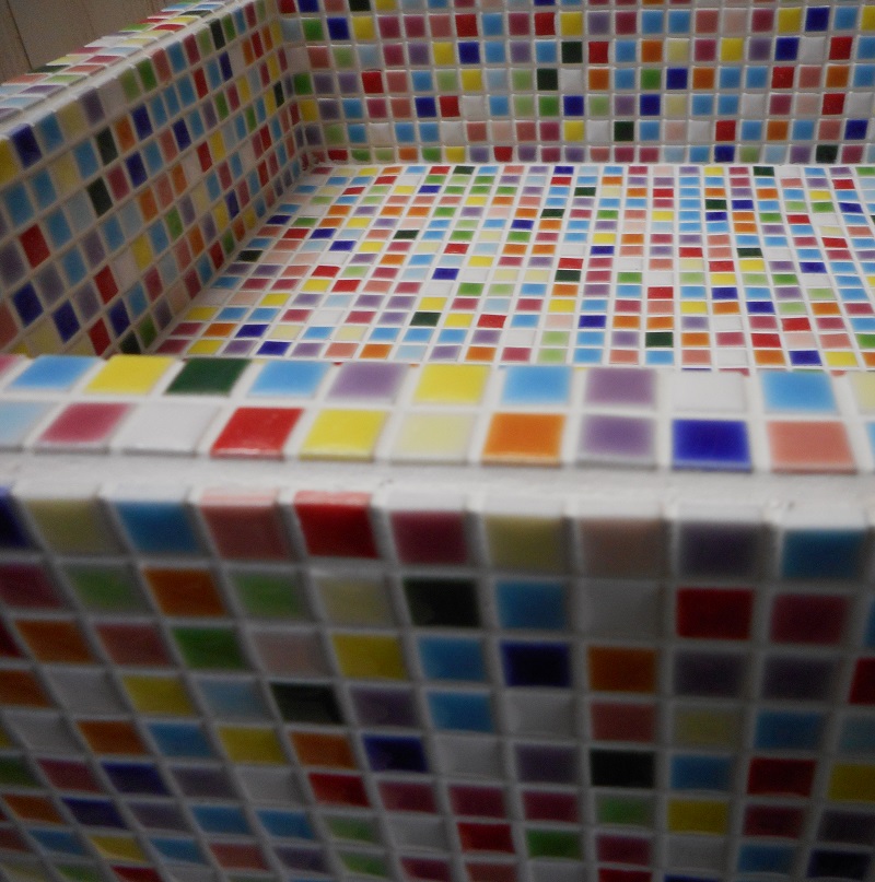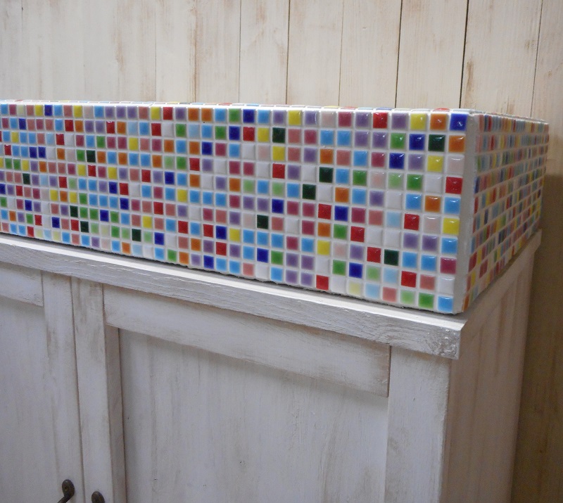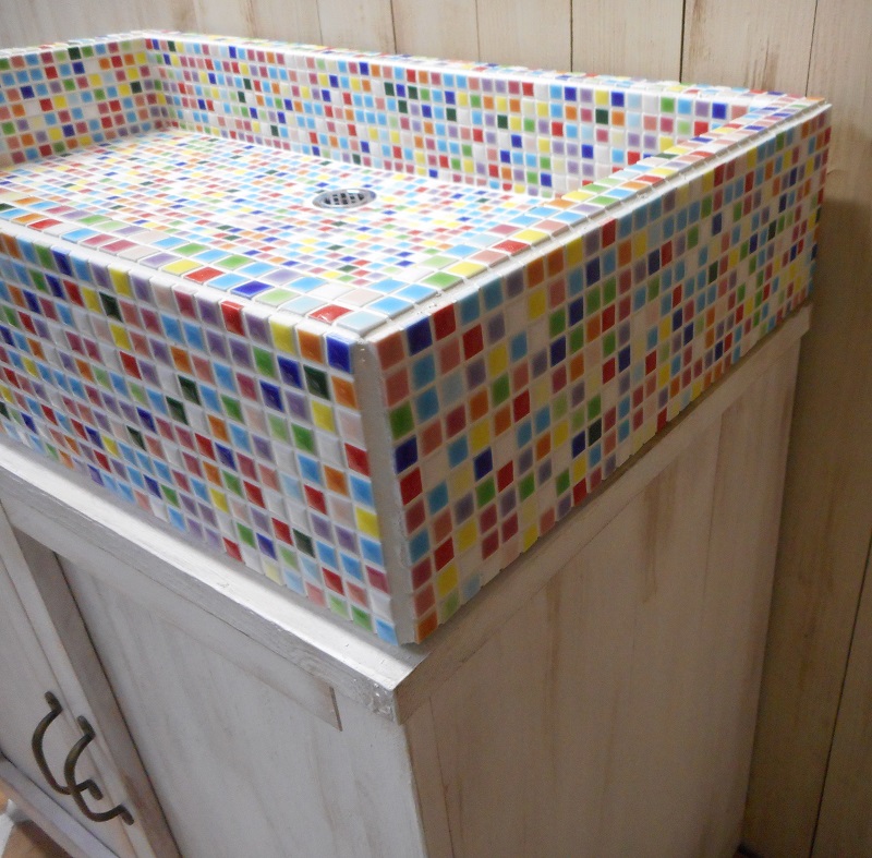 いろとりどりの10ミリのモザイクタイルをはった流し台
