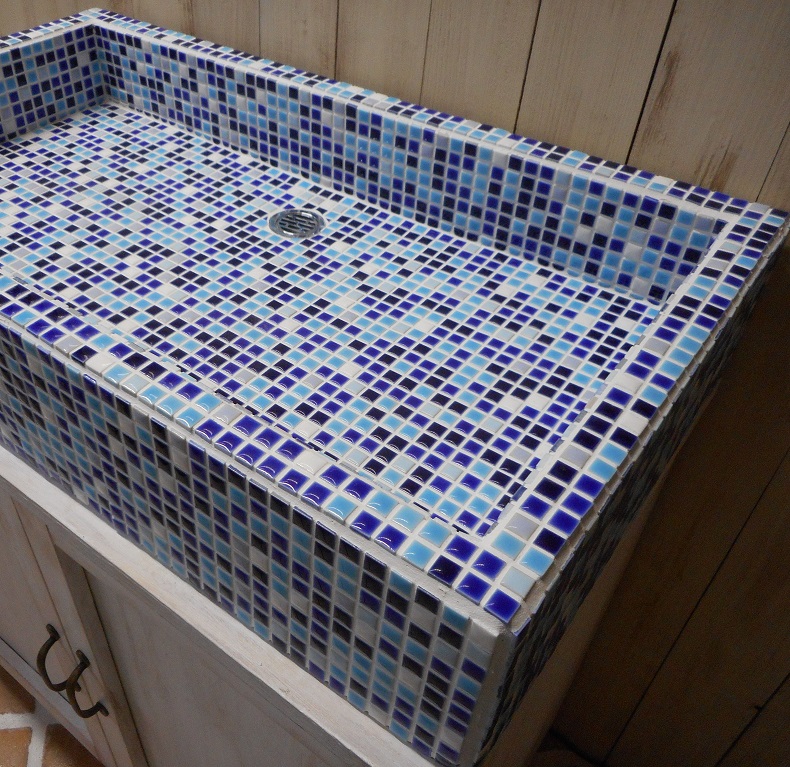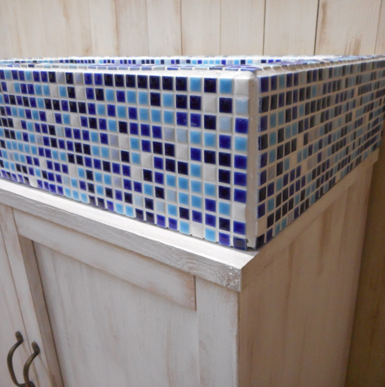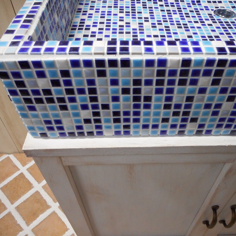 藍色 空色 群青色の10ミリモザイクタイルをはった流し台